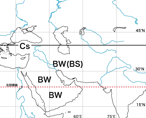 中緯度高圧帯(亜熱帯高圧帯)の影響を受けて乾燥しますが、冬は東西に走る新期造山帯に沿って偏西風が吹きこみ、降水をもたらします。