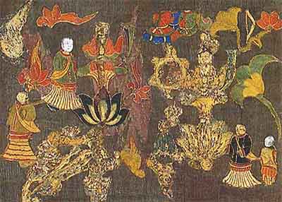 仏の世界(極楽浄土)と厩戸王の往生の様子を描く刺繡