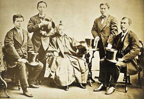 (左から木戸孝允・山口尚芳・岩倉具視・伊藤博文・大久保利通)