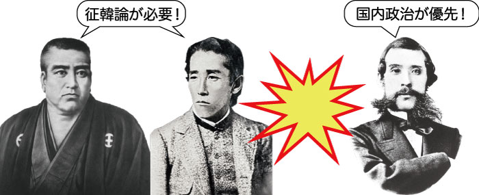 岩倉使節団派遣中の新政府、いわゆる留守政府のあいだでは、西郷隆盛・板垣退助らが、朝鮮との国交を武力で開く征韓論