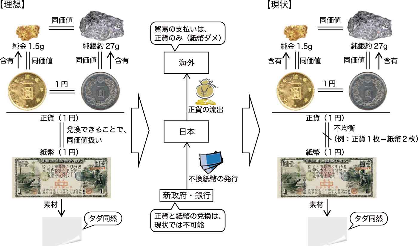 国立銀行条例の改正と西南戦争の戦費捻出で、日本国内の不換紙幣は増加を続けました。貴金属を含むことで価値を裏付けられた金貨や銀貨とは違って、不換紙幣は大量発行に伴って信用を失い、額面の価値で扱われなくなりました。新政府は、金貨・銀貨1円と紙幣1円の価値を均衡させ、兌換可能にすることに挑みました。