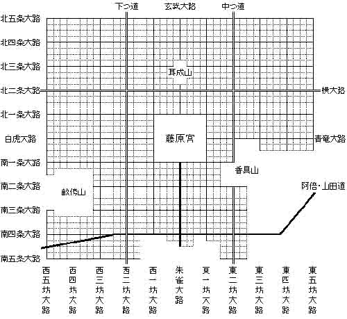 大王(天皇)などが住む「宮」の区域と、条と坊による区画で構成される都