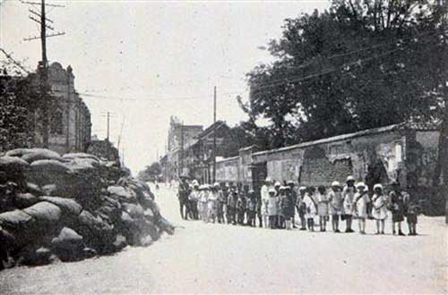 1927年3月、国民革命軍が日本を含む各国の領事館と居留民を襲いました。国民革命軍は規律が取れておらず、婦女の陵辱におよぶ者もいました。これに対して米英は報復をおこない、また、日本は日本人居留民の保護を目的に出兵しました。下図は、日本軍に守られて学校へ向かう日本人の子どもたちです。しかし、日本人居留民への襲撃は全て防ぎきれず、済南事件が生じました。