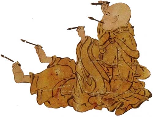 空海は才能にあふれ、仏教だけでなく、漢詩や書道にも名を残しています。書道では両手のみならず、口や両足も同時に使えたそうです。この様な書き方では、「弘法にも筆の誤り」も当然と言えます。