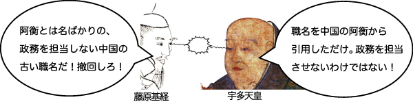 宇多は、基経が勤めてきた補佐役に、「阿衡」という職名を付けて基経を再任しました。