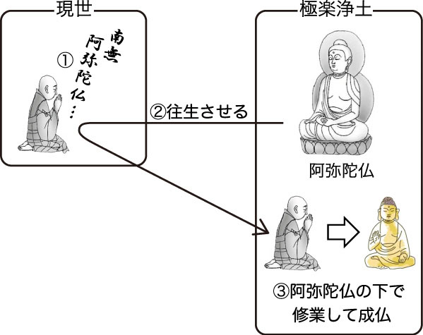 - 極楽で如来の導きを受けて仏になる(成仏)。