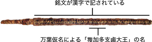 鉄刀・鉄剣の銘文には、武(雄略天皇)と思われる「ワカタケルオオキミ」の名があります。
