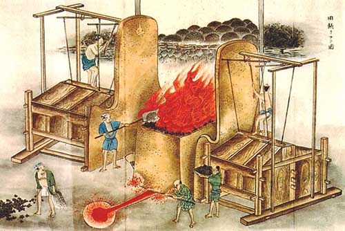 足踏みふいごで空気を送るたたら精錬が、中国地方を中心に展開