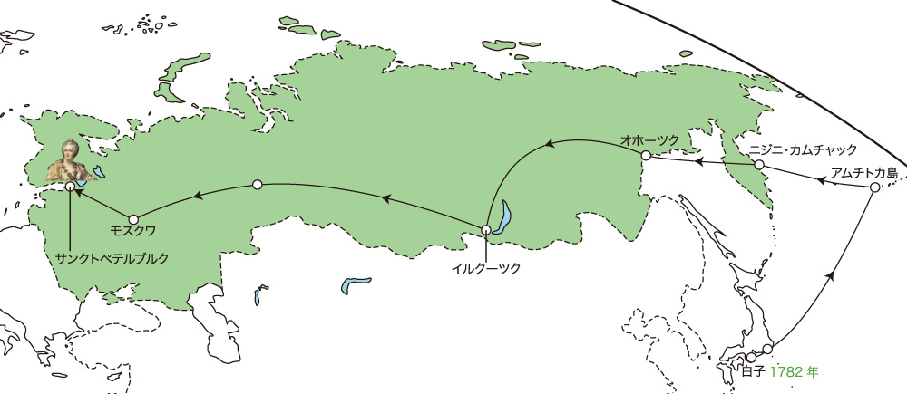 光太夫はロシア人に救われ、1791年、ロシアの首都サンクトペテルブルクで、女帝エカチェリーナ2世に拝謁して帰国を許されました。